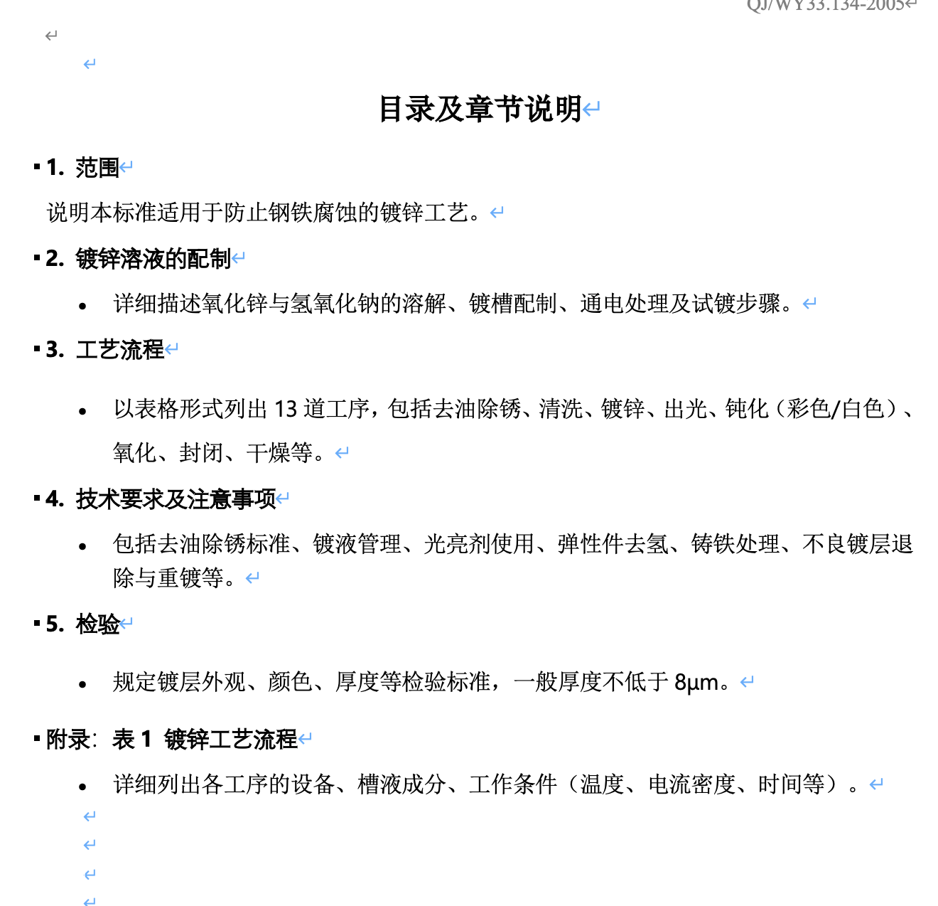 本标准规定了镀锌工艺的适用范围、镀液配制方法、工艺流程、技术要求和检验方法。适用于钢铁件的防腐蚀镀锌处理,涵盖从去油除锈到镀锌、钝化、封闭、干燥的全流程操作规范,包括槽液成分、工作条件、注意事项及不良镀层的处理方式。