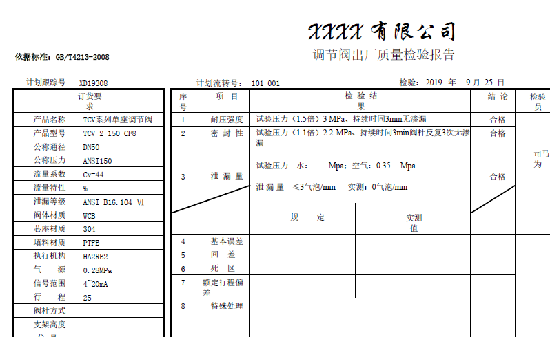 调节阀出厂检测报告