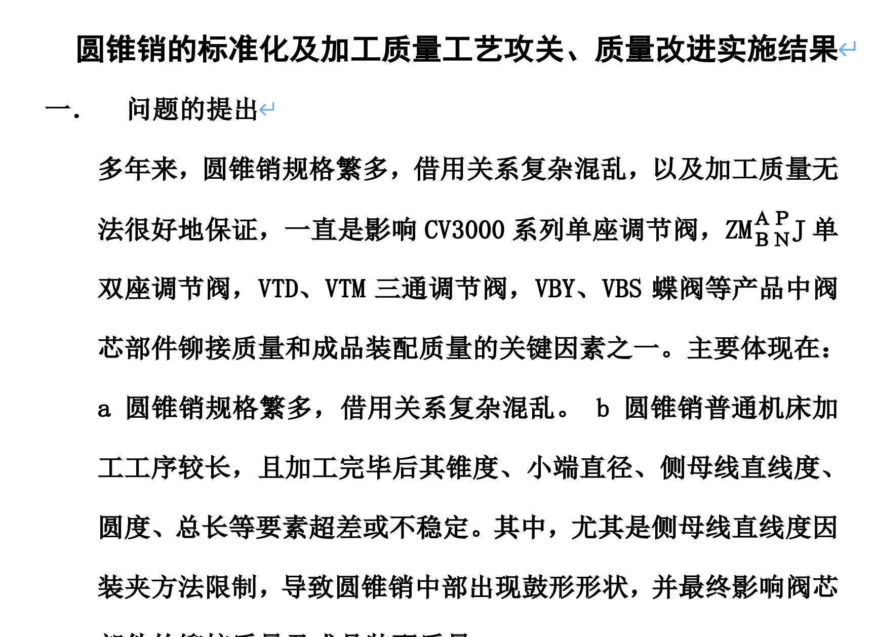 本资料围绕圆锥销在多个系列调节阀、蝶阀产品中的标准化与加工质量问题展开。圆锥销规格繁多、借用关系混乱,加工质量不稳定(尤其是侧母线直线度、锥度等),严重影响了阀芯部件的铆接与成品装配质量。课题组通过标准化整理,将圆锥销规格由41种缩减至27种,并引入数控车床B20进行工艺改进,实现一次装夹完成加工,大幅提升加工效率与质量。相关技术文件已整理完成,预计十一月中下旬可正式投产。