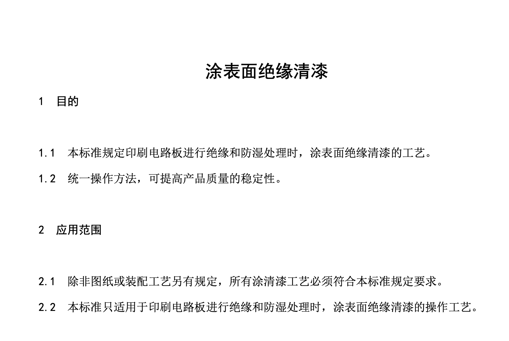 本文档规定了印刷电路板涂表面绝缘清漆的工艺标准,适用于绝缘和防湿处理。内容涵盖清洁剂、清漆及稀释剂的选用,清洗、刷漆、浸漆、局部涂漆的具体操作步骤,以及烘干和质量核对要求。标准统一了操作方法,旨在提高产品质量的稳定性。