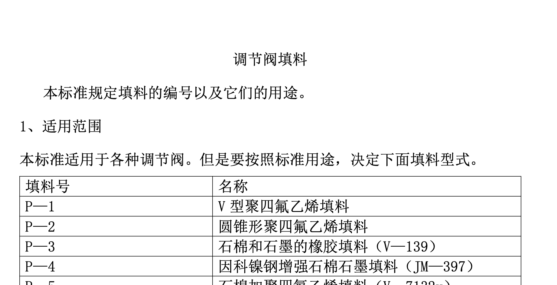 该标准规定了调节阀所用填料的编号、型式、适用压力与温度范围、生产厂及适用场合,旨在为调节阀填料的选择提供标准化依据。标准中列举了多种填料类型,如V型聚四氟乙烯填料、圆锥形聚四氟乙烯填料、石棉石墨橡胶填料等,并根据不同工况(如压力、温度、介质性质)提供了填料选型指南,包括常规填料和特殊组合填料的应用建议,适用于各类调节阀的密封设计。