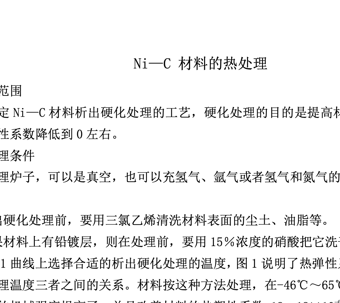 本文档详细规定了Ni—C材料的析出硬化热处理工艺,旨在提高材料的机械强度并使热弹性系数降至接近零。热处理可在真空或特定气氛中进行。工艺包括预处理、根据热弹性系数与Cr+Ti含量的关系曲线选择适宜温度、控制热处理时间等最终要求热处理后材料表面无氧化膜。