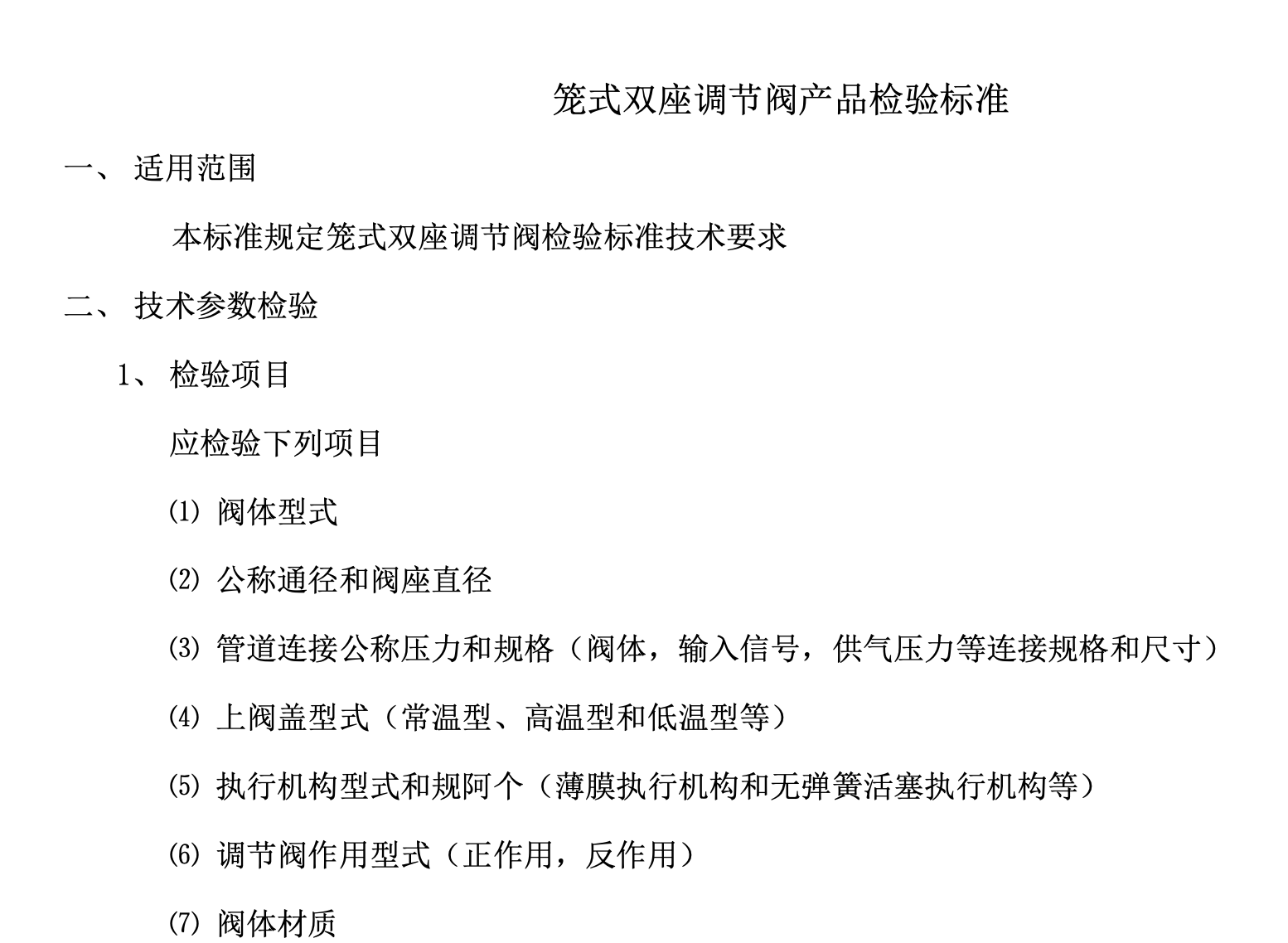 本文档规定了该类型调节阀在出厂前需执行的一系列检验项目、方法及判别标准。主要内容包括: * 技术参数检验:涵盖阀体型式、公称通径、材质、执行机构、流量特性等20项技术参数的核对; * 外观检验:对铸件、锻件、机加件、焊接、装配、涂漆等表面质量进行目测检验; * 尺寸检验:重点检验法兰距、平行度、螺纹配合等关键尺寸; * 压力与密封性检验:包括阀体水压试验、气密性试验、执行机构气密性试验及阀座泄漏量检验; * 性能检验:测试起始点、额定行程、线性、变差及手轮机构动作等性能指标。所有检验均设有具体的试验压力、时间、允许误差及合格标准,确保产品符合设计及安全要求。