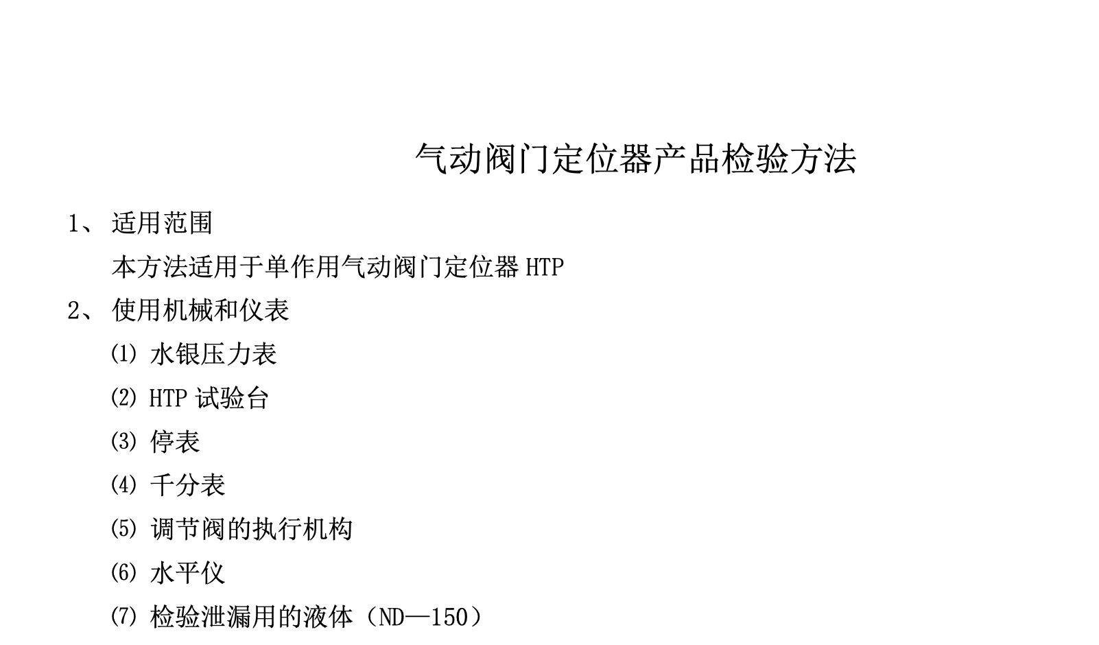 本文件详细规定了适用于单作用气动阀门定位器HTP的检验流程。内容包括: 适用范围、检验设备与仪表、检验项目、检验方法、规定检验、外观检验、结构检验、性能检验、最终步骤。
