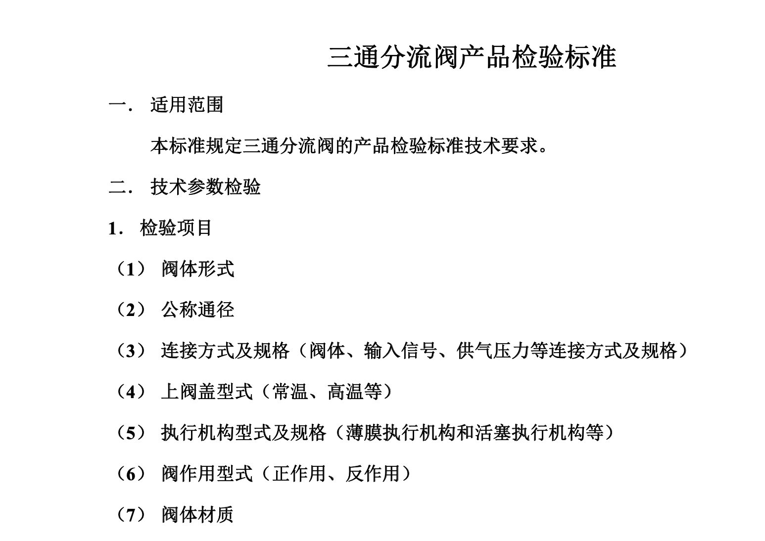 本文件系统规定了该类产品的检验范围、技术参数检验、外观检验、尺寸检验、水压试验、气密性试验、泄漏量试验以及性能检验等各项内容。标准明确了检验项目、方法及判别标准,涵盖阀体形式、材质、连接方式、执行机构、涂漆、铭牌等多项技术细节,并对各类试验的压力、时间、允许误差等作出具体规定,旨在确保三通分流阀的质量与性能符合技术要求。