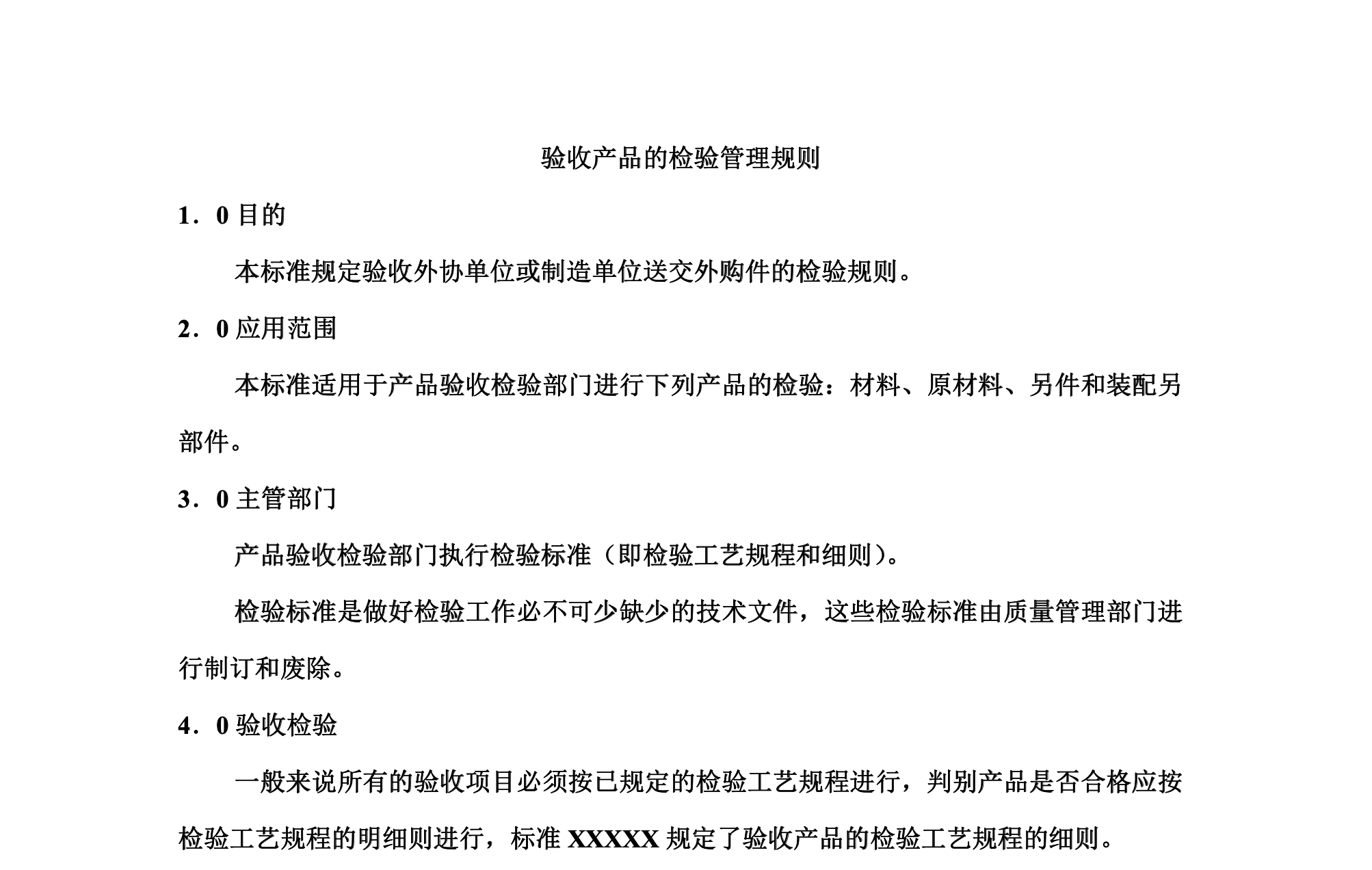 本文旨在规范外协或制造单位所提交外购件的验收检验流程。适用范围包括材料、原材料、零件及装配部件的检验。主管部门为产品验收检验部门,执行由质量管理部门制定的检验工艺规程和细则。验收检验须按规定流程进行,可辅以更具体的检验细则。检验方法主要依据抽样检验规则,也可根据情况采用校核检验或全数检验。文件还详细规定了检验设备的管理要求、验收产品的工艺流程步骤,并对表面处理产品、现场实地检验及缺陷预防与处理提出了具体操作要求。