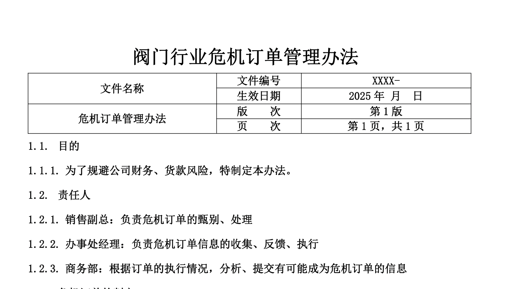 本办法旨在识别和管理阀门行业中可能导致财务与货款风险的“危机订单”,以降低公司经营风险。文件明确了销售副总、办事处经理和商务部在危机订单管理中的职责分工,界定了三类危机订单的判定标准,包括账龄过长、客户异常情况以及我方失误导致的潜在风险。管理流程涵盖信息收集、风险判断、方案制定与执行反馈等环节,形成从识别到处理的闭环管理机制。