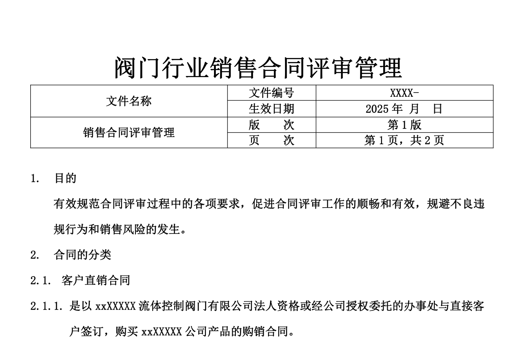 本办法旨在规范阀门行业销售合同的评审流程,以规避销售风险、促进合同评审工作的顺畅与有效。文件明确了销售合同的三种分类(客户直销合同、代理商销售合同、经销商合同),并分别规定了商务条款评审和技术条款评审的内容、方式与责任部门,评审结果作为合同执行、客户信息更新及佣金支付的依据,确保合同风险可控、制度执行到位。