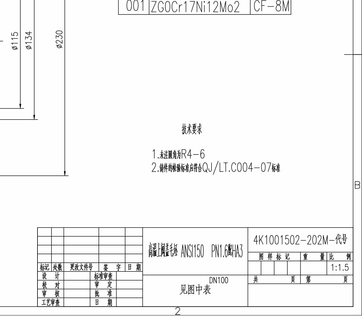 笼式调节阀上阀盖毛坯ANSI150 .高温DN100-Model