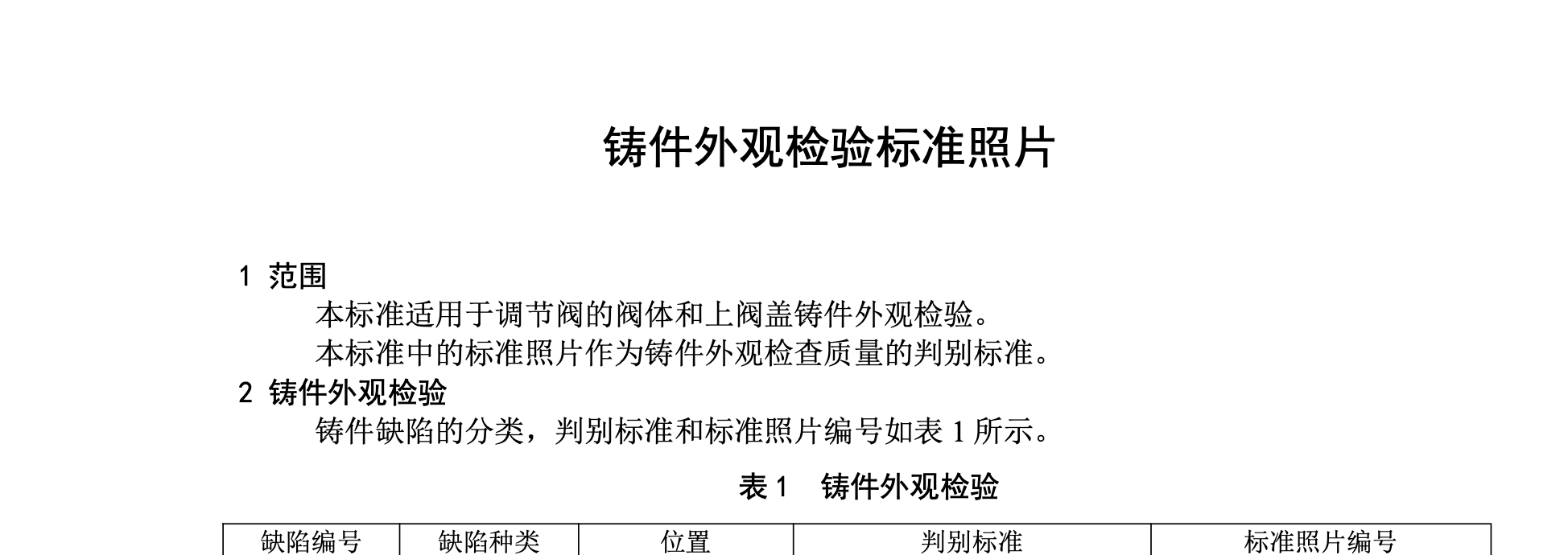 本文为调节阀阀体和上阀盖铸件的外观检验提供了可视化的判定依据。标准通过缺陷分类表详细列出了20种常见铸件表面缺陷(如裂纹、砂点、气孔、夹砂等),并针对每种缺陷在不同表面状态(如黑皮表面、加工表面、内表面)下给出了具体的判别标准。同时,标准以标准照片编号的形式将缺陷类型与实物照片对应起来,并在表2中提供了具体缺陷案例的照片编号、零件名称、材料、检验位置、判定结论及备注,将抽象的文字标准转化为直观的图像参照,实现了铸件外观检验的标准化与客观化判定。
